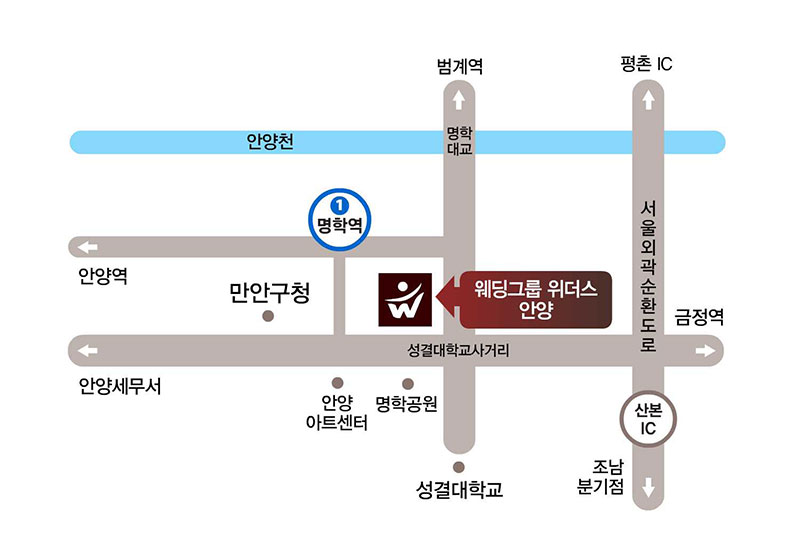 Location Guide 웨딩그룹위더스 안양오시는 길 웨딩그룹위더스 안양에 찾아 오시는길을 안내해 드립니다. Tel : 031-468-6600상담시간 09:00~20:00 (매주 월요일 휴무)
